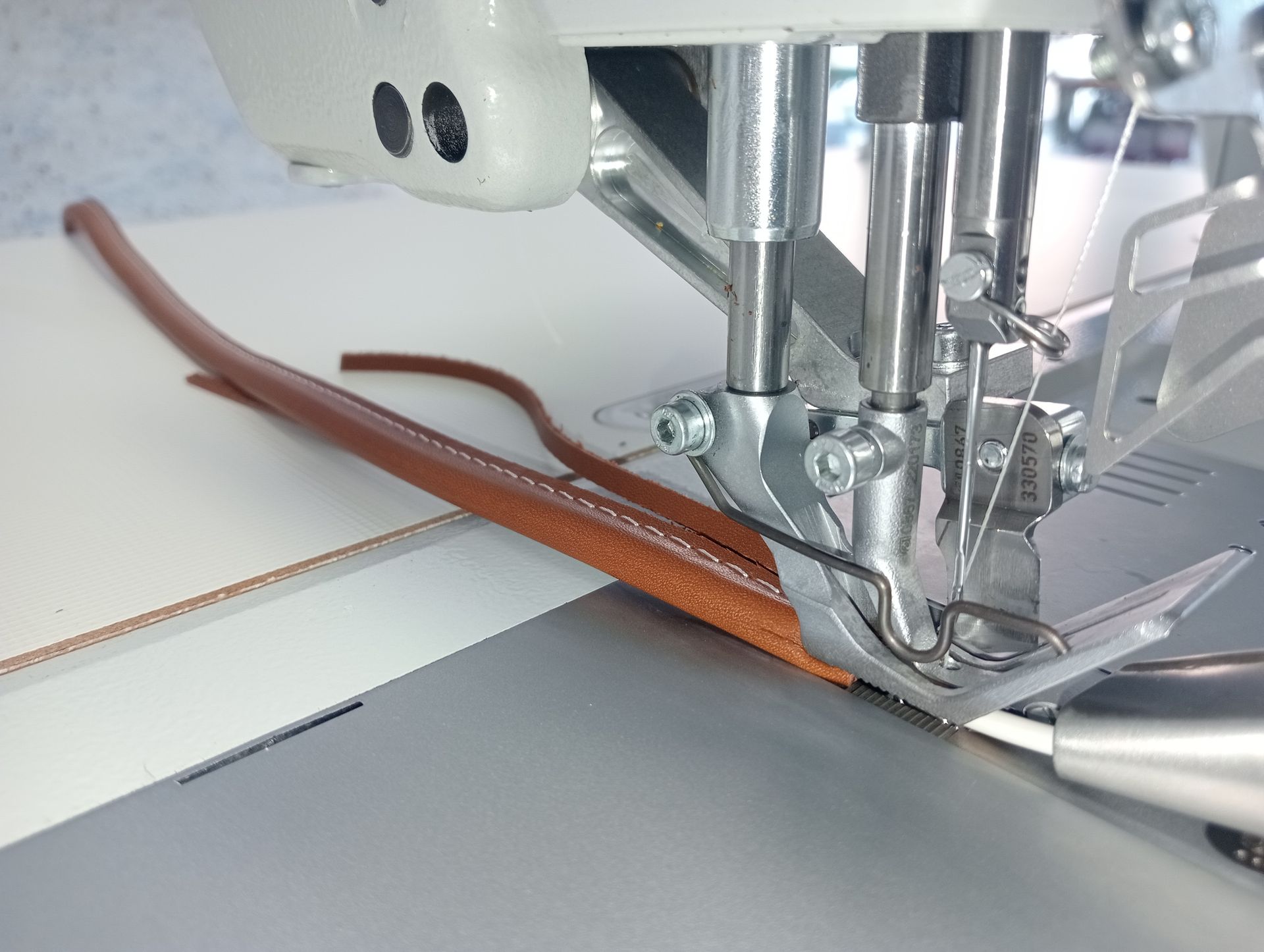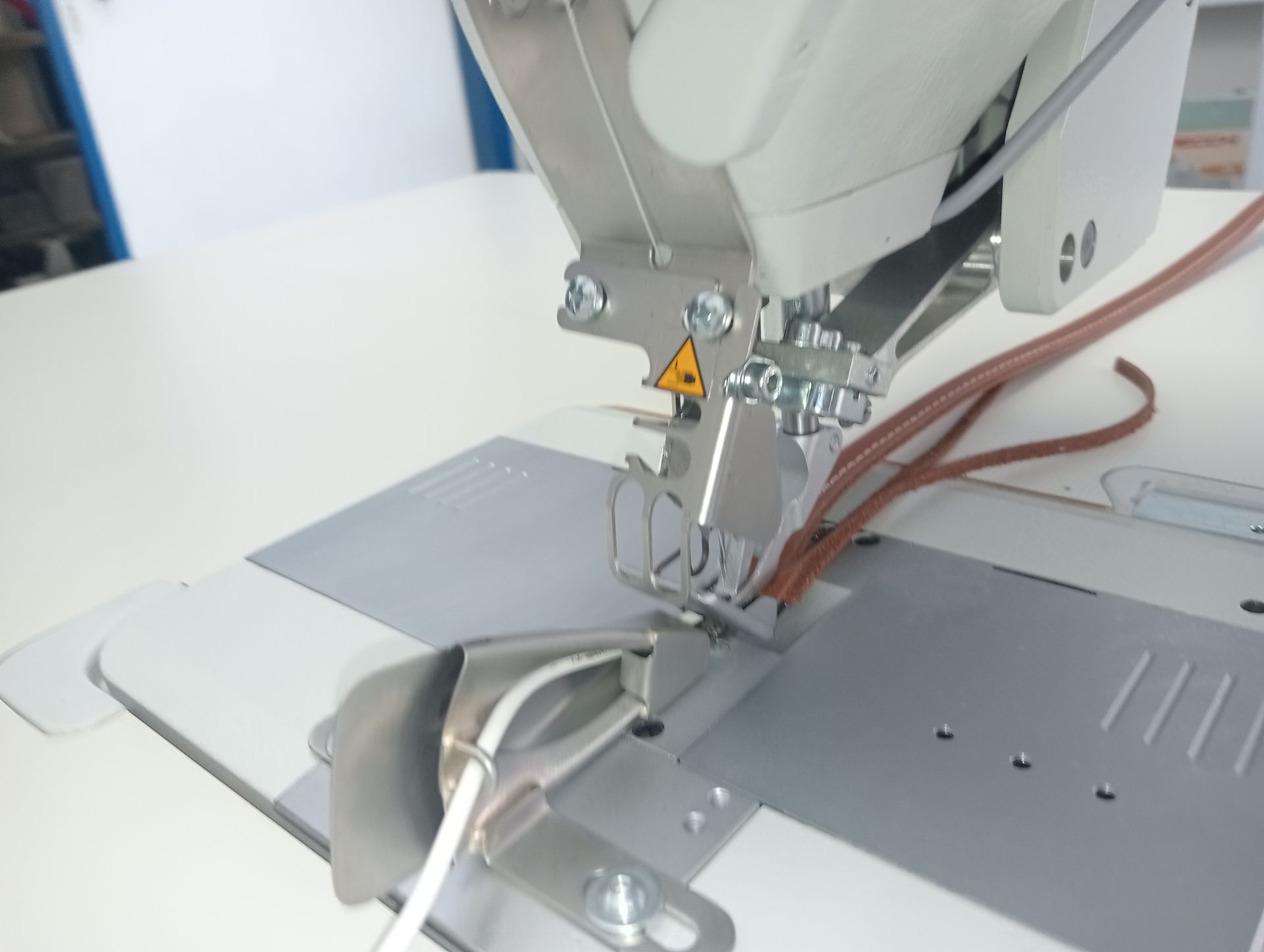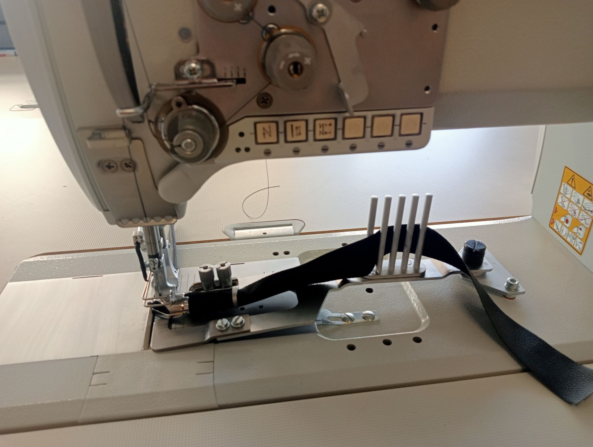 - Alimentazione nastro dal basso per impunturare sotto il nastro di cucitura.